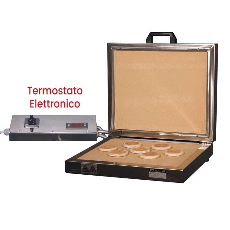 Tigelliera elettrica professionale per la cottura fino a 24 crescentine (tigelle). Dotata di gruppo comandi con termostato elettronico per una cottura sempre costante.